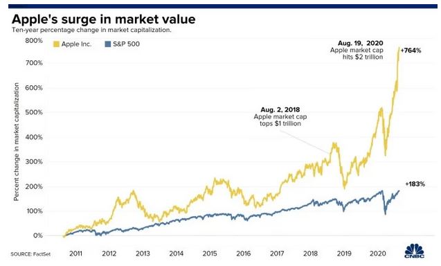در سال ۲۰۱۸ نیز اپل تبدیل توانست عنوان نخستین شرکت آمریکایی با ارزش بازار یک تریلیون دلاری را از آن خود کند. گفتنی است از ابتدای سال ۲۰۲۰ میلادی تاکنون، سهام اپل ۶۰ درصد افزایش داشته است و نسبت به سال گذاشته با افزایش ۱۲۰ درصدی همراه بوده است.