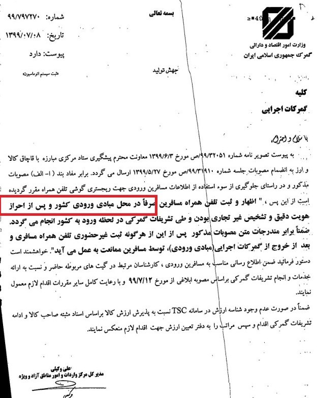 علی وکیلی مدیرکل دفتر واردات گمرک ایران در بخشنامه ای به گمرکات اجرایی اعلام کرد، از روز 12 مهر سال جاری، اظهار و ثبت تلفن همراه مسافرین صرفا در محل مبادی ورودی کشور و پس از احراز هویت دقیق و تشخیص غیر تجاری بودن و طی تشریفات گمرکی در لحظه ورود به کشور انجام میگردد.