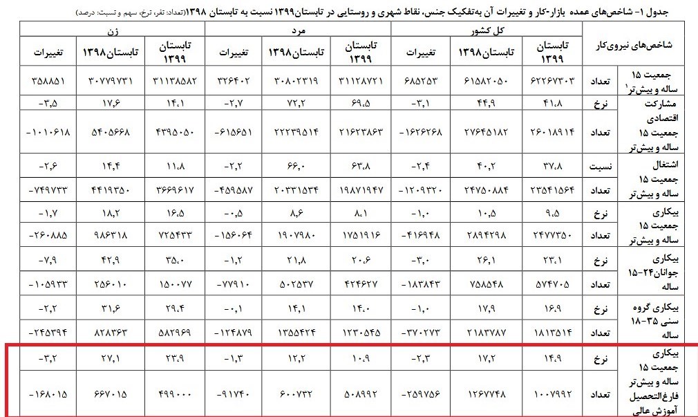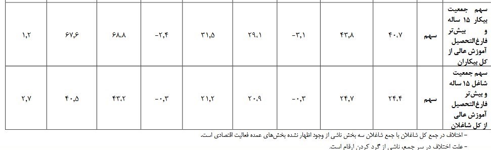 آخرین گزارش مرکز آمار ایران از چکیده نتایج نیروی کار تابستان 99، بررسی نرخ بیکاری جمعیت 15ساله و بیشتر فارغ التحصیلان آموزش عالی، نشان می دهد 14.9 درصد از جمعیت فعال فارغ التحصیل آموزش عالی بیکار بوده اند. این نرخ در بین زنان نسبت به مردان و در نقاط روستایی نسبت به نقاط شهری بیش تر بوده است. بررسی روند تغییرات این نرخ حاکی از کاهش 2.3 درصدی در تابستان 99 نسبت به فصل مشابه سال قبل است.