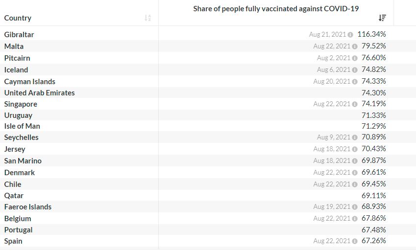از آنجایی که هنوز کودکان بطور عمده در برابر کووید-۱۹ واکسینه نشدهاند، بهترین کشورها از نظر واکسیناسیون به ۷۰ تا ۸۰ درصد جمعیت خود دو دوز واکسن تزریق کردهاند. برای مثال کشورهای ایسلند، سنگاپور و امارات متحده عربی همگی نزدیک به ۷۵ درصد جمعیتشان را بطور کامل در برابر کرونا واکسینه کردهاند.