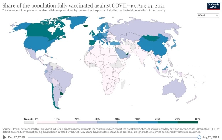 طبق دادههای «Our World in Data» که توسط پژوهشگران دانشگاه آکسفورد مدیریت میشود، تا به امروز نزدیک به ۲۵ درصد جمعیت جهان بطور کامل علیه کووید-۱۹ واکسینه شدهاند. همچنین روزانه نزدیک به ۳۳.۵ میلیون دوز واکسن به افراد تزریق میشود.