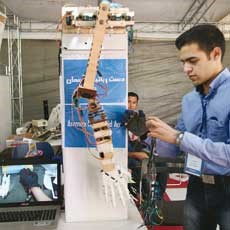 گروهی از دانشجویان دانشگاه فردوسی و خیام مشهد رباتی برای سنجش وضعیت سلامت دست و انجام تمرین های مناسب فیزیوتراپی آن ساخته اند. این ربات در برقراری تعامل بین یک اپراتور و متخصص پزشکی کار می کند و عملکرد آن به این صورت است که ابتدا بیمار یا فرد داوطلب می نشیند و دست خود را درون بازویی رباتیک قرار می دهد. در مرحله بعد بازی خاصی در صفحه مانیتور روبه روی بیمار ظاهر می شود که فرد باید توسط بازو نشانگر بازی را به نقاط صحیح هدایت می کند. بعد از انجام این بازی، دستگاه اطلاعات وضعیت دست و مدل حرکت مچ و بازوی فرد را نمایش می دهد که با تعامل با پزشک متخصص می توان از آنها برای شناسایی علامت های بیماری های مرتبط با دست و همچنین ارائه تمرین های مناسب و کنترل شده به دست بیمار استفاده کرد.