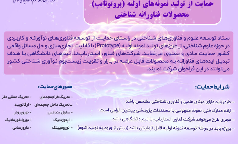 ستاد توسعه علوم و فناوریهای شناختی در راستای حمایت از توسعه فناوریهای نوآورانه و کاربردی در حوزه علوم شناختی در فراخوانی از طرحهای تولید نمونه اولیه Prototype با قابلیت تجاریسازی و حل مسائل واقعی کشور حمایت مادی و معنوی میکند.