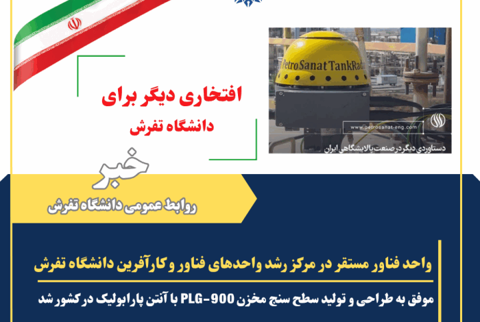 دکتر ” محمد علی مهرپویا” در این رابطه توضیح داد: شرکت دانشبنیان پردازشگران پترو صنعت امیرکبیر، واحد فناور مستقر در مرکز رشد واحدهای فناور و کارآفرین دانشگاه تفرش، با تکیه بر دانش بومی و توان متخصصان داخلی، موفق به طراحی و تولید سطح سنج مخزن PLG-900 با آنتن پارابولیک در کشور شد.