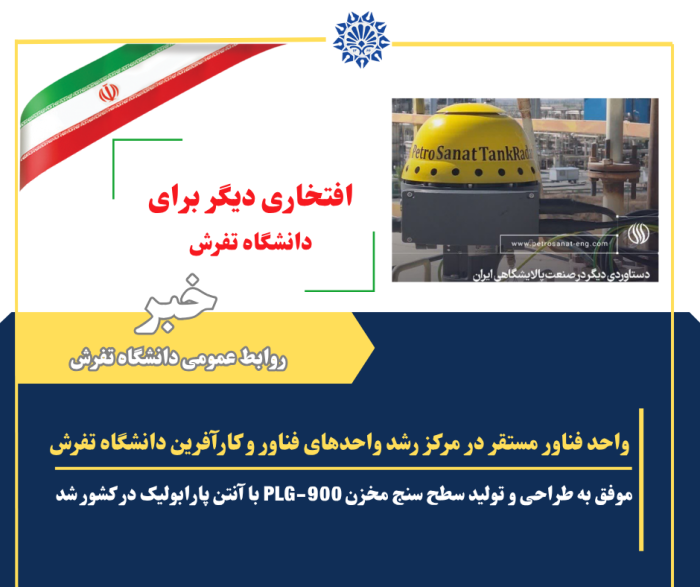 دکتر ” محمد علی مهرپویا” در این رابطه توضیح داد: شرکت دانشبنیان پردازشگران پترو صنعت امیرکبیر، واحد فناور مستقر در مرکز رشد واحدهای فناور و کارآفرین دانشگاه تفرش، با تکیه بر دانش بومی و توان متخصصان داخلی، موفق به طراحی و تولید سطح سنج مخزن PLG-900 با آنتن پارابولیک در کشور شد.