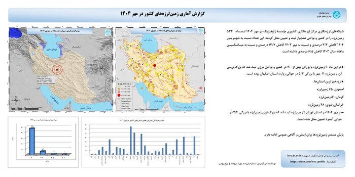 طبق آخرین گزارش مؤسسه ژئوفیزیک دانشگاه تهران، شبکه‌های لرزه‌نگاری مرکز لرزه‌نگاری کشوری در شهریور ماه ۱۴۰۴ در مجموع ۵۳۴ زمین‌لرزه را در کشور و نواحی همجوار ثبت کردند که این تعداد نسبت به شهریور امسال ۳.۴ درصد، نسبت به مدت مشابه سال قبل ۱۳.۷ درصدی داشته است اما نسبت به میانگین ماهانه سال ۱۴۰۳ کاهش ۶.۵ درصدی را ثبت کرده است.