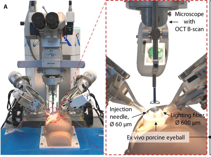محققان دانشگاه جان هاپکینز اخیرا یک سیستم روباتیک خودکار ساخته اند که می تواند این فرایند را با اطمینان انجام دهد. الگوریتم های یادگیری عمیق که تصاویر جمع آوری شده با میکروسکوپ های جراحی و اسکن های مقطعی بافت چشم را که با روش OCT جمع آوری می شوند را تحلیل می کند، راهبری این سیستم را برعهده دارند.