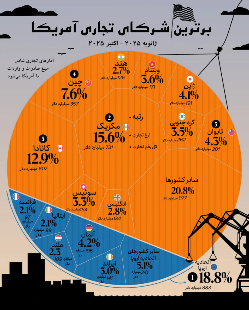 به گزارش خبرگزاری سیناپرس، بر اساس داده‌های تجارت خارجی ایالات متحده، اتحادیه اروپا در ۱۰ ماه نخست سال ۲۰۲۵ با سهم ۱۸.۸ درصدی و ارزشی معادل ۸۸۳.۳ میلیارد دلار، بزرگ‌ترین شریک تجاری آمریکا بوده است؛ در مجموع، حجم تجارت دوجانبه آمریکا با شرکای اصلی خود در این بازه زمانی به ۴.۷ تریلیون دلار رسید؛ سالی که با نوسانات و تغییرات در سیاست‌های تجاری همراه بود.