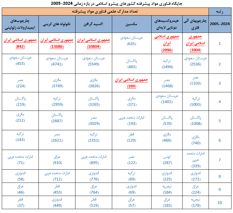 بر اساس تازه‌ترین داده‌های استنادی بین‌المللی، جمهوری اسلامی ایران در چند حوزه کلیدی فناوری مواد پیشرفته، جایگاه نخست را در میان کشورهای اسلامی و جایگاهی برجسته در سطح جهانی به دست آورده است؛ این موفقیت‌ها در حالی حاصل شده که برنامه‌های ملی ویژه‌ای برای توسعه و تجاری‌سازی این فناوری‌ها در دست تدوین است.