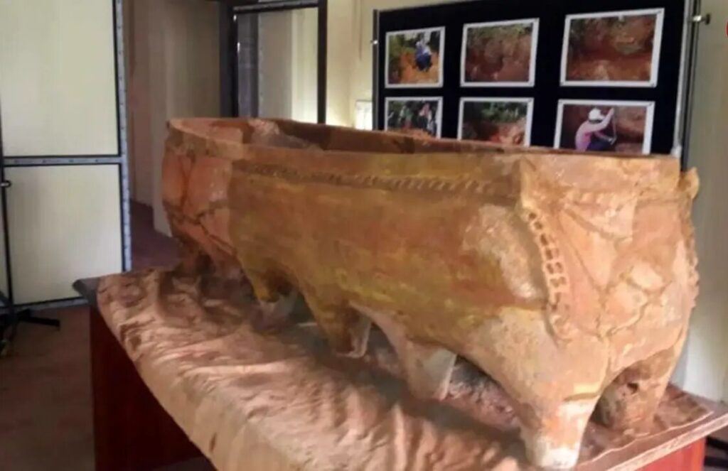 این یافته توسط «بررسی باستانشناسی هند» (ASI) در عمقی حدود دو متر پایینتر از سطح کنونی زمین کشف شد. این تابوت سفالی پخته با طول تقریبی ۱۷۰ سانتیمتر، عرض ۴۵ سانتیمتر و عمق ۵۰ سانتیمتر، بهدلیل طراحی عجیب خود خیلی زود جلب توجه کرد: این سازه روی دوازده پایهی با دقت شکلدادهشده قرار دارد.