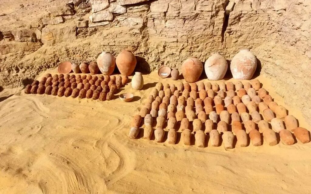 باستانشناسان درون دو اتاقک، حدود ۱۶۰ ظرف سفالی کشف کردند. بیشتر این ظروف به دورهی پادشاهی کهن تعلق دارند و بسیاری از آنها سالم به دست آمدهاند. چندین خمره هنوز دارای نوشتههایی به خط هیراتیک هستند؛ خطی تندنویس که برای امور اداری و نگارشهای روزمره به کار میرفت. این نشانهها ممکن است حاوی اطلاعاتی درباره محتویات یا مالکیت باشند. بررسیهای اولیه نشان داده که این ظروف در گذشته حاوی مایعات و غلات بودهاند. چنین موادی بخشی از لوازم تدفینی محسوب میشدند که همراه مردگان قرار دفن میشدند تا آنان را در زندگی پس از مرگ تأمین کنند.