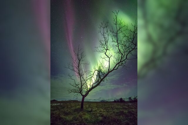 به گزارش سیناپرس، این عکس یک تصادف بصری بین شاخه‌های تیره درخت و درخشش یک شفق قطبی در دوردست است.