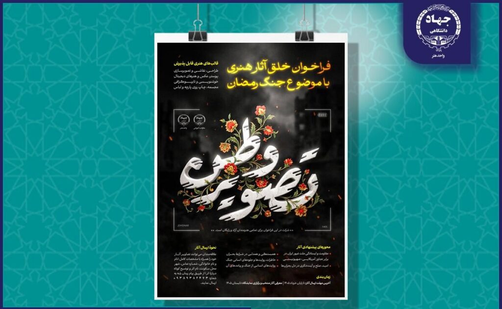 به گزارش سیناپرس به نقل از روابط عمومی جهاددانشگاهی هنر، معاونت آموزشی جهاددانشگاهی با مشارکت واحد هنر این نهاد، فراخوان ملی «تصویر وطن» را با هدف بازتاب هنرمندانه مفاهیم مقاومت، ایستادگی و روایتهای انسانی از وطنمان در برابر تجاوز آمریکایی – صهیونیستی در جنگ تحمیلی سوم را منتشر کرد.
