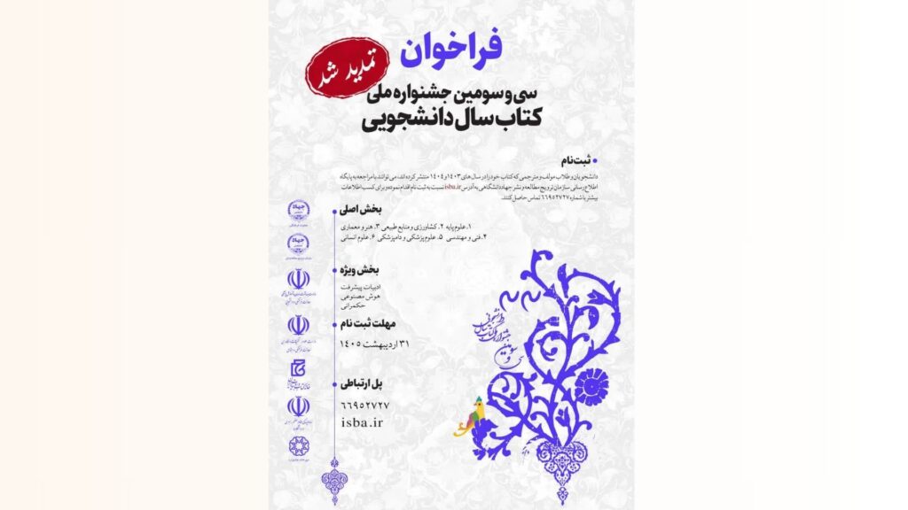 دبیرخانه کتاب سال دانشجویی مهلت ارسال آثار به سیوسومین جشنواره ملی کتاب سال دانشجویی را تا ۳۱ اردیبهشتماه ۱۴۰۵ تمدید کرد.