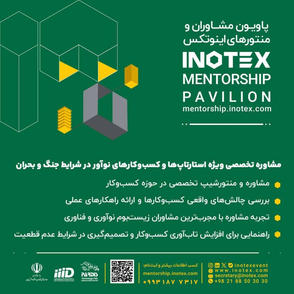 علاقهمندان برای بهرهمندی از خدمات مشاوره و منتورشیپ در پاویون مشاوران اینوتکس میتوانند برای کسب اطلاعات بیشتر و ثبتنام به وبگاه mentorship.inotex.com مراجعه کرده یا با شماره ۰۹۹۳۱۸۷۷۳۱۷ تماس بگیرند.