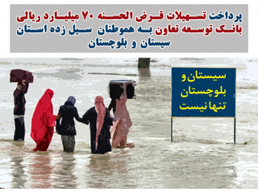 بانک توسعه تعاون در پی وقوع سیل اخیر استان سیستان و بلوچستان که موجب بروز مشکلات و صدمات زیادی برای جمعی از هموطنان گردید حسب وظیفه ذاتی و سازمانی و همدردی و مشارکت با آسیب دیدگان این حادثه آماده پرداخت وام قرضالحسنه 70 میلیارد ریالی به هموطنان سیلزده استان سیستان و بلوچستان است.