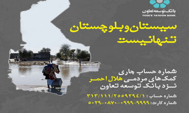 بانک توسعه تعاون در چارچوب وظایف حرفهای و تحقق مسئولیت اجتماعی و انسانی همچنین بهمنظور فراهم نمودن شرایط و تمهیدات لازم برای کمک به خسارت دیدهگان و آسیب دیدهگان ناشی از سیل اخیر در استان سیستان و بلوچستان اقدام به اعلام شماره حساب کرد.